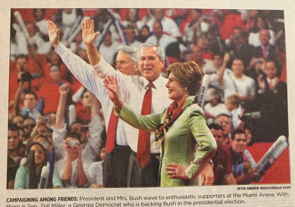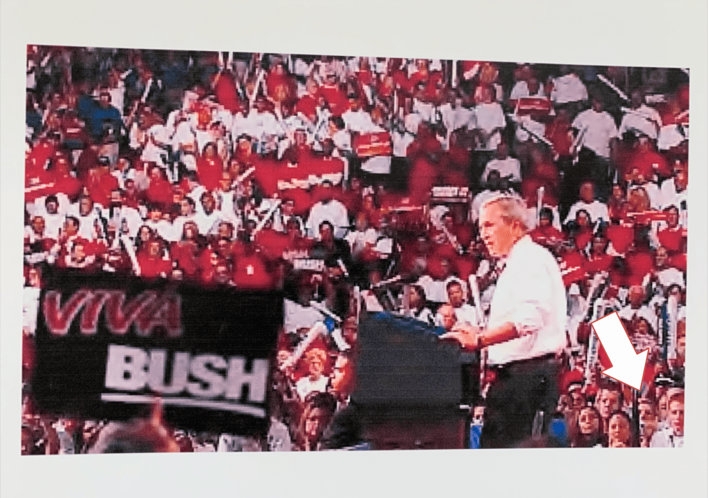 It was at the Victory 2004 Campaign Rally in Florida (seen in photo above) where I was one of the “enthusiastic supporters” President and Mrs. Bush were waving to, as noted in the newspaper photo caption. I’m the girl holding up her camera, partially visible in the photo above amongst the crowd. In case it’s hard to spot me, the photo below has an arrow pointing out my head and camera in another photograph from the same event on a newspaper’s website (the highest quality copy I could find in 2004).